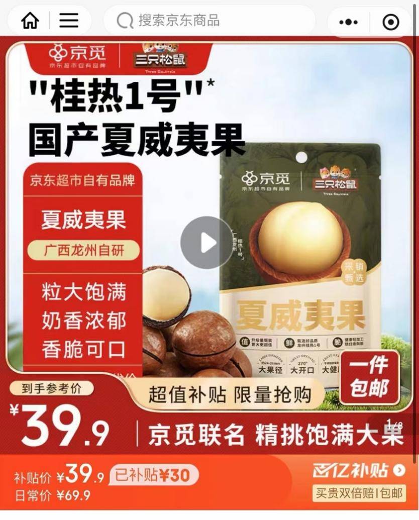 在今年的夏威夷果採收季,京東超市與廣西龍州縣和三隻松鼠合作定製夏威夷果新品,全部選用天花板級別的24毫米到26毫米果徑的大果,售價卻降低到19.9元一斤,其餘更小果徑的夏威夷果會比這個價格再低一元至數元。