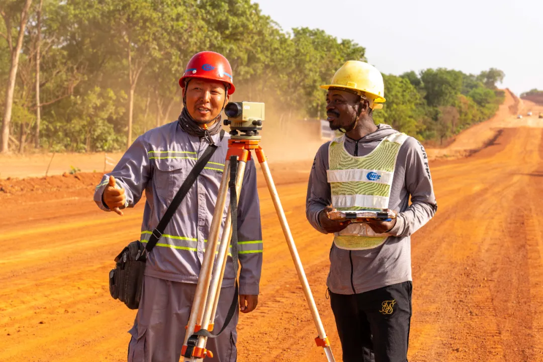 ▲2023年4月,在科特迪瓦西北部奧迭內省,來自多哥的測量員卡馬(右)與他的中國師傅李建在北部公路項目施工現場工作。