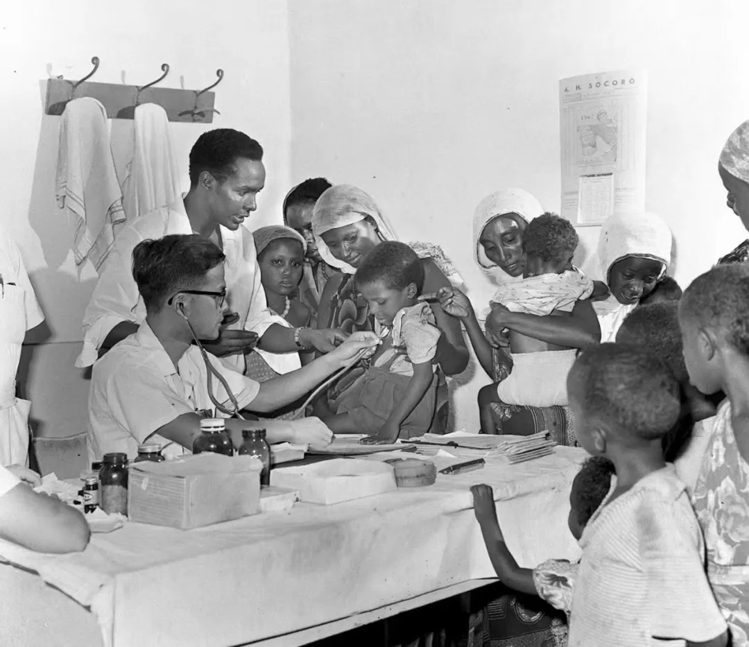 ▲1968年4月,中國醫療隊在索馬里阿弗戈依鎮巡迴醫療時為當地兒童治病。