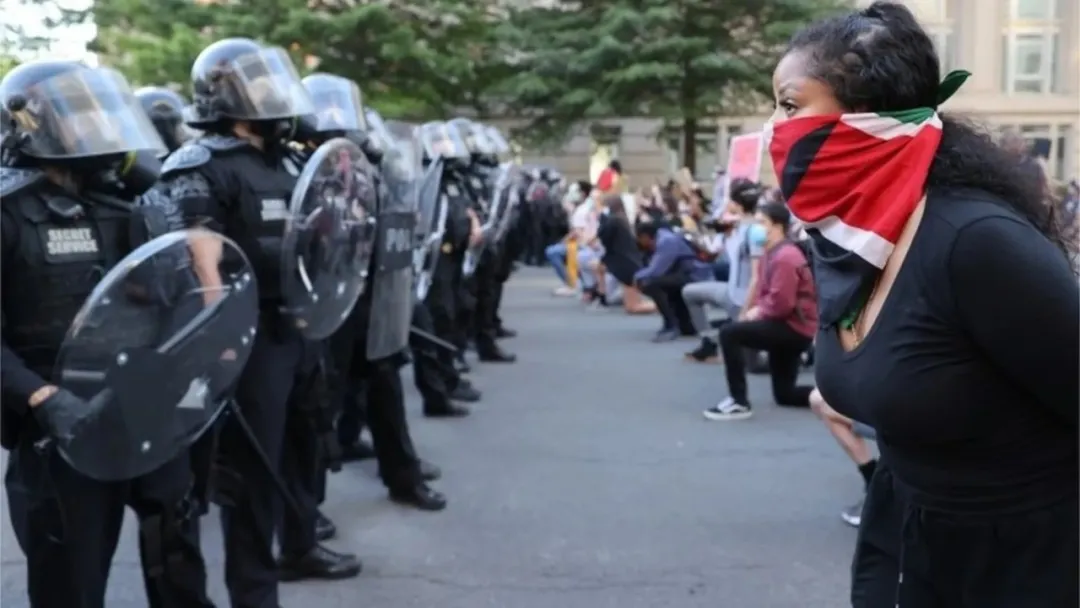 ▲2020年5月,非洲裔男子喬治·弗洛伊德遭白人警察跪壓頸部後死亡。此後,美國多地爆發抗議示威。圖為一名用肯尼亞國旗包裹臉部的女性在示威中與警察發生衝突。