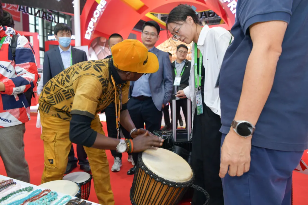 ▲2023年11月,在第六屆進博會國家展馬裏共和國館,展商向觀眾介紹非洲鼓。