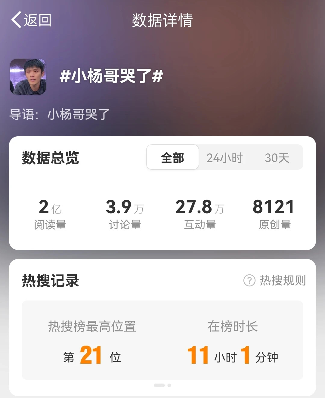情到深處,小楊哥還在直播間哭紅了眼。這一哭,還登上了熱搜。