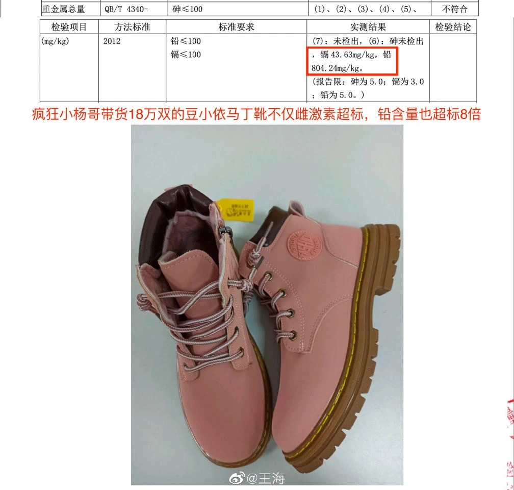 王海9月8日發微博稱,小楊哥帶貨的一款兒童鞋“豆小依”馬丁靴“有毒”。