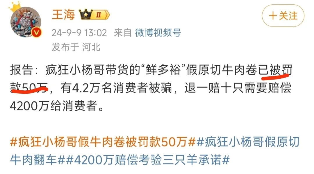 9月9日,職業打假人王海在微博爆料,小楊哥帶貨的原切牛肉卷是假貨,被武漢市青山區市場監督管理局罰款50萬。