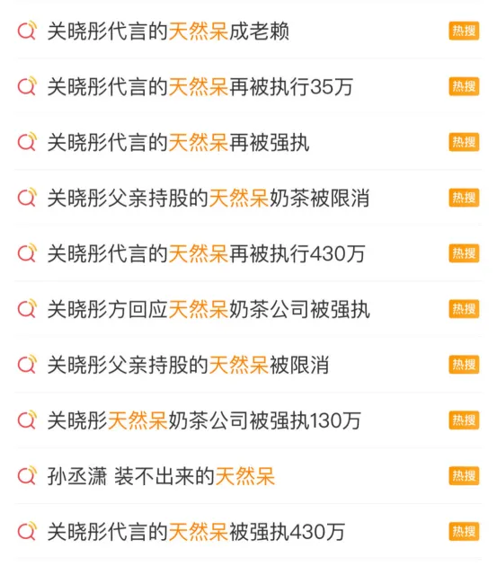 此外,“天然呆”多次因負面消息登上微博熱搜。比如“關曉彤代言的天然呆成老賴”“關曉彤代言的天然呆再被執行35萬”“關曉彤父親持股的天然呆奶茶被限消”“關曉彤代言的天然呆再被執行430萬”等。