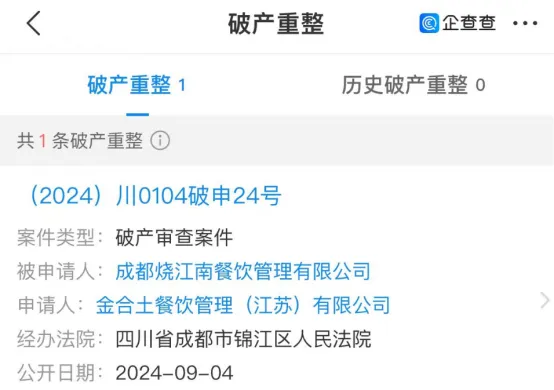 9月4日,成都燒江南餐飲管理有限公司也被金合土餐飲管理(江蘇)有限公司申請破產重整。
