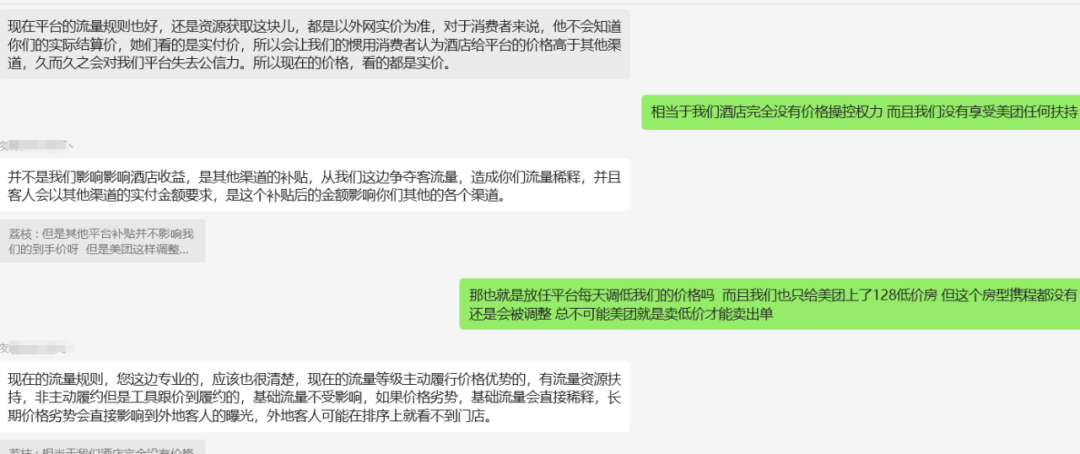 但更換的第二任業務經理更過分,直接在天狼系統裏將商家全年的價格體系進行更改,李婧投訴到美團總部,總部解釋是因為該酒店全年的價格體系沒有做到“全平台價優”才進行的調價,美團不做干涉。然後她又打市政電話投訴,得到的反饋是美團總公司在北京不歸他們管理。