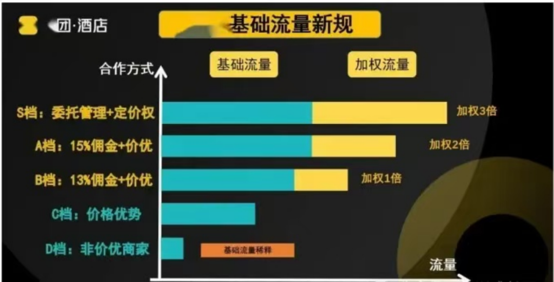 原則來説,是需要商家同意才能開啓,但現在基本上大部分酒店商家根本沒有抵抗籌碼,要想流量正常必須配合價格最優。8月4日,美團推出基礎流量新規,商家被分為五類,除D檔商家外,大部分商家都要給到“價優”,顧名思義,就是價格最優。一旦拒絕,可能面臨着流量被稀釋的境地。但在這一新政之前,商家們已經承受不住美團追價系統和業務經理的折騰了,酒店經營者調侃是美團Q2財報背後的“最佳貢獻者”。