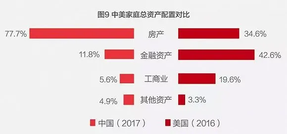 第三個問題是居民資產負債表結構問題:居民的資產中,房地產資產佔比較高、過高的問題。這方面的統計非常之多,基本上,大數看,中國居民家庭資產中有70~80%為房地產,美國則在30%左右。