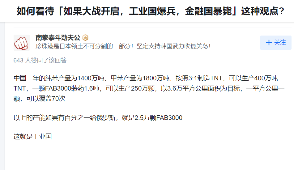 好了這些咱們不掰扯了,但總而言之,如果真打起來,你以為美帝就沒有鋼鐵產能了?真以為美帝沒有造船能力了?拿着現在的工業能力,就説美帝金融國如何虛胖了,完全是拿着現在國際貿易秩序這個前提來討論戰爭問題,實屬兒戲。