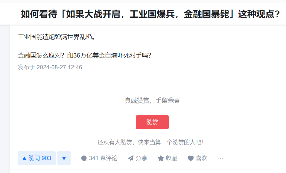 好了這些咱們不掰扯了,但總而言之,如果真打起來,你以為美帝就沒有鋼鐵產能了?真以為美帝沒有造船能力了?拿着現在的工業能力,就説美帝金融國如何虛胖了,完全是拿着現在國際貿易秩序這個前提來討論戰爭問題,實屬兒戲。