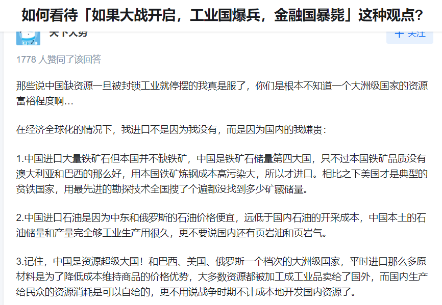 當然,也有人説中國不靠進口,本身資源也非常豐富,之所以要進口,是國外更便宜。所以真被封鎖了也不怕。
