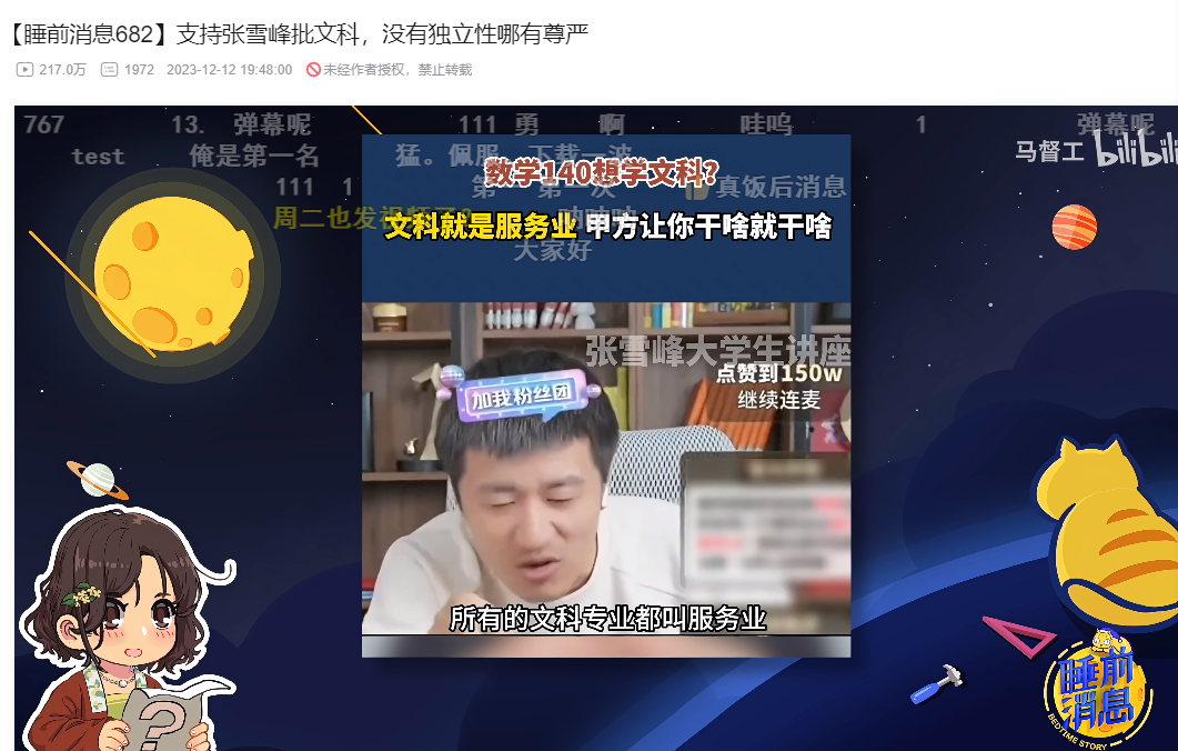 工業黨思維,還有一個典型傾向,就是瞧不起文科,甚至是文科無用論,馬前卒睡前信息評點張雪峯文科就業都是服務業,都是靠舔,這期節目就很典型。