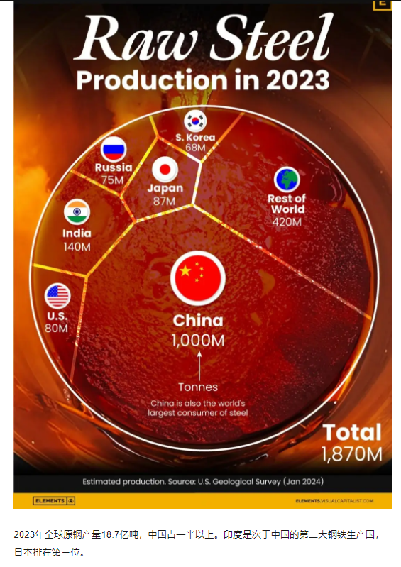 就拿鋼鐵產量來説,2023年中國鋼鐵產量10億噸,佔全球鋼鐵總產量一大半。