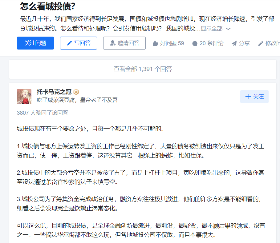 至於説到中國金融業,中國的金融業規模恐怕不一定比美帝小啊。就城投債規模來説……