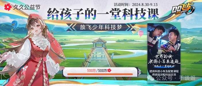 舉個例子,8月30日QQ飛車在遊戲內上線了【給孩子一堂科技課】活動。賽車手們可以通過捐贈1元(立得10鑽+泳池派對套裝)、或者通過公益行為獲得小紅花。全服達成500萬多小紅花公益目標後,將通過支持公益機構在90所學校開展2000節科技課。