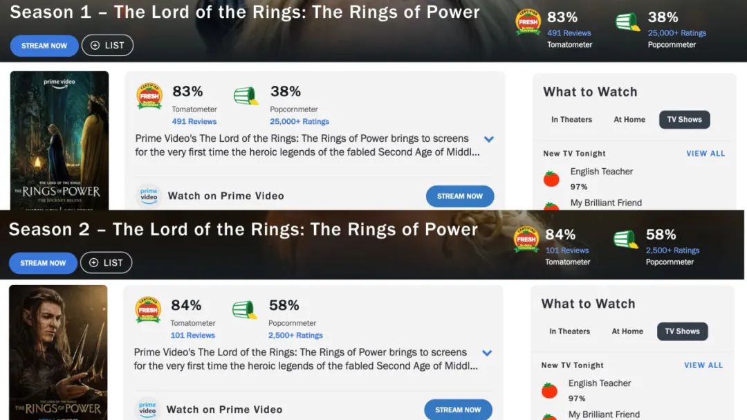 目前亞馬遜尚未公佈新一季的觀看數據,雖然首播前三集的口碑較前作有所提升,但與其他大熱劇集相比依舊掙扎,顯示在10億美元的天量預算背後,亞馬遜進軍高成本奇幻劇仍面臨挑戰。科技巨頭欲撼動好萊塢版圖並非易事。