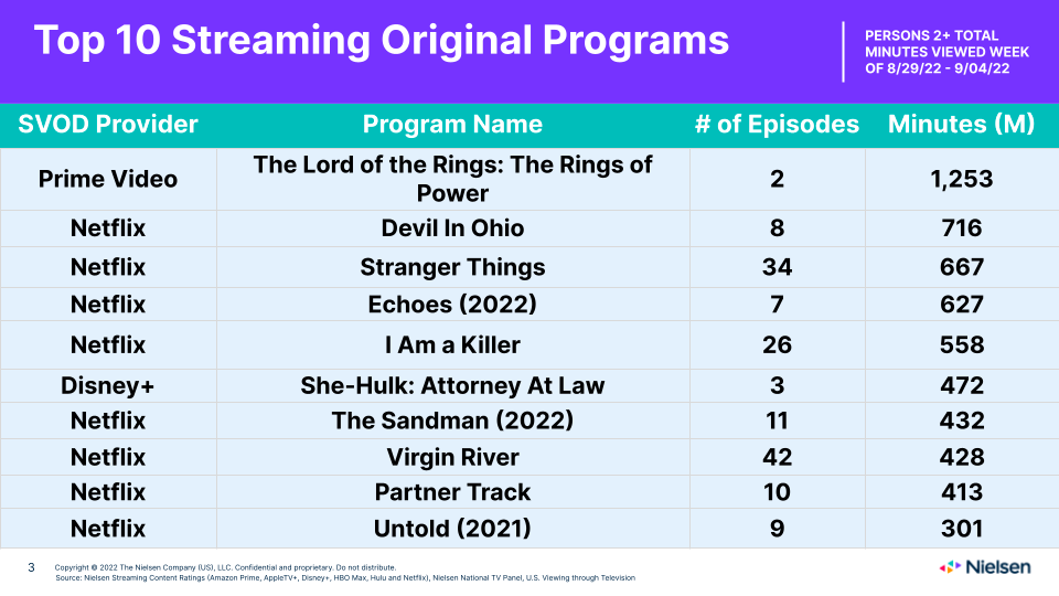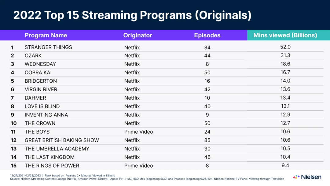 在尼爾森發佈的2022年度原創劇集榜中,《指環王:力量之戒》第一季以94億分鐘排在第15名,剛好位居榜單末尾;這一數字甚至遜於同屬亞馬遜的《黑袍糾察隊》,雖然後者錄得的106億分鐘共涵蓋24集,即為彼時已推出的前三季總計。