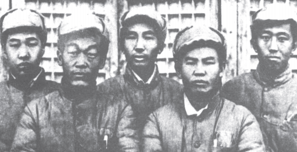 1944年於陝西王家莊合影。右起:馬烽、西戎、束為、孫謙、胡正(人稱“西李馬胡孫”)