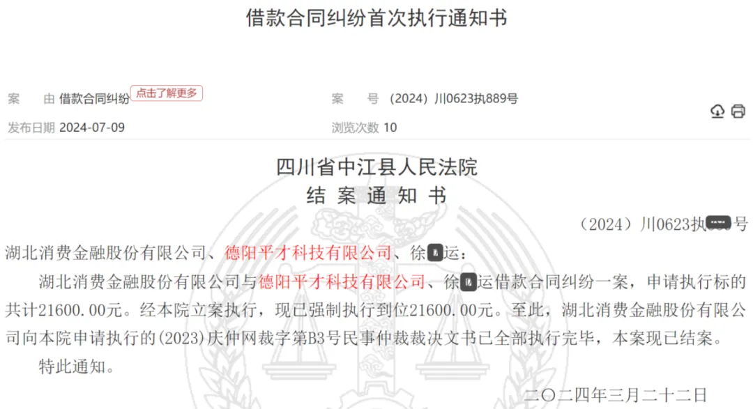 但讓人意外的是,中江縣人民法院只在中國裁判文書網發佈1篇結案通知書,發佈時間2024年7月9日。結案通知書顯示:湖北消金與平才科技、徐X運借款合同糾紛一案,申請執行標的21600元。經本院立案執行,現已強制執行到位21600元,落款時間為2024年3月22日。