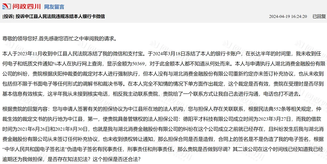 例如,有網友在問政四川留言:中江人民法院凍結本人的原因是達飛雲貸16000元的欠款,一直正常還款,後達飛倒閉無法還款,債權轉移到湖北消金,湖北消金起本人要求全額還款,但達飛雲貸不能提供本人借款明細和已還款金額,包括在達飛雲貸的2000保證金也無法退還。中江縣人民法院在這麼多證據不足的情況下,對本人的名下銀行卡進行凍結,本人提出異議。