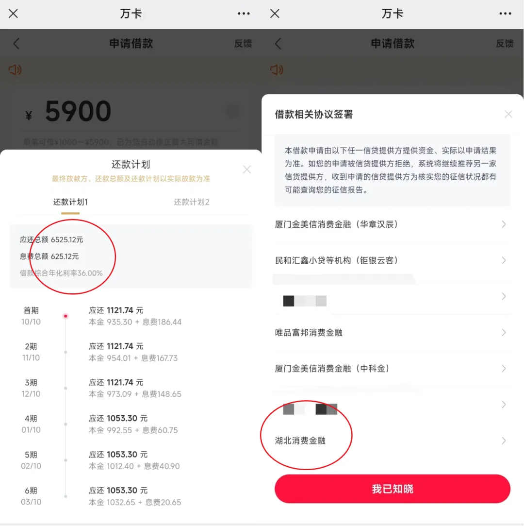 作為湖北消費消金的第二大股東,玖富數科與湖北消金在業務層面展開了合作。例如,開甲財經在微信公眾號“玖富萬卡”申請借款發現,借款5900元,分6期,前3期還1121.74元,後3期還1053.30元,借款綜合年化利率35.97%。