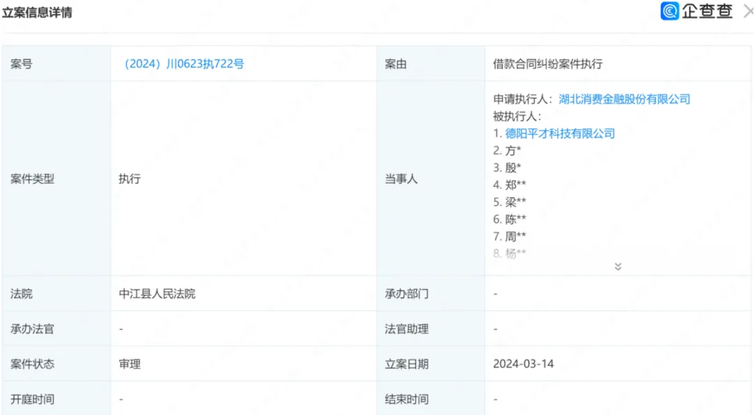 2024年3月14日,中江縣人民法院共有2個相關立案。其中,案號“(2024)川0623執722號”的申請執行人為湖北消費金融股份有限公司,被執行人為德陽平才科技有限公司及23名自然人;案號“(2024)川0623執721號”的申請執行人為湖北消費金融股份有限公司,被執行人為德陽平才科技有限公司及21名自然人。