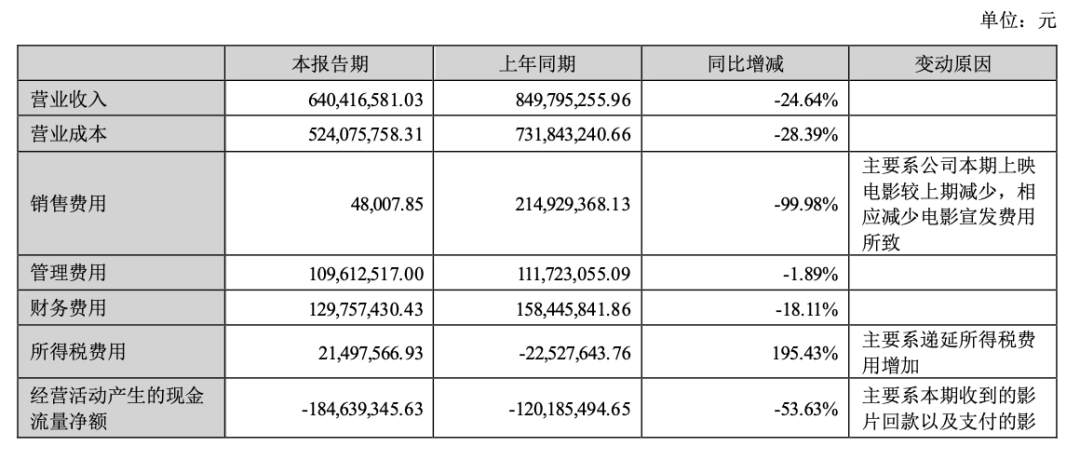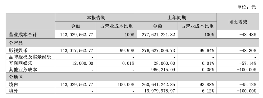 比如博納,總體營業成本同比下降28.39%;其中宣發環節的銷售費用縮減最多,下降了99.98%。在上半年度,博納除了參投了一部《飛馳人生2》以外,總體而言表現平平。其餘參投的項目,如《狗陣》,以及暑期檔的《傳説》和《紅樓夢之金玉良緣》,在票房上均面臨不同程度的失利。