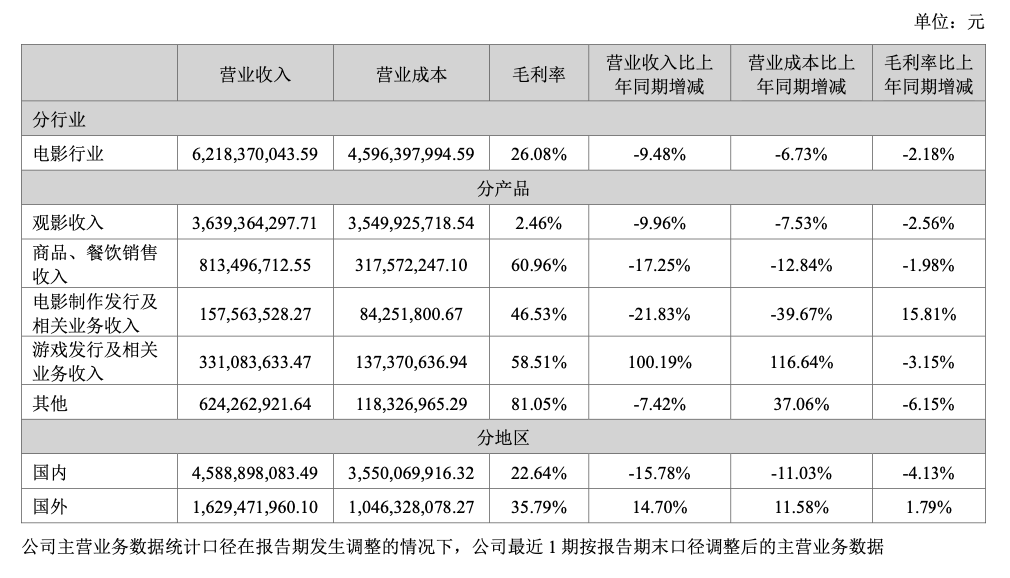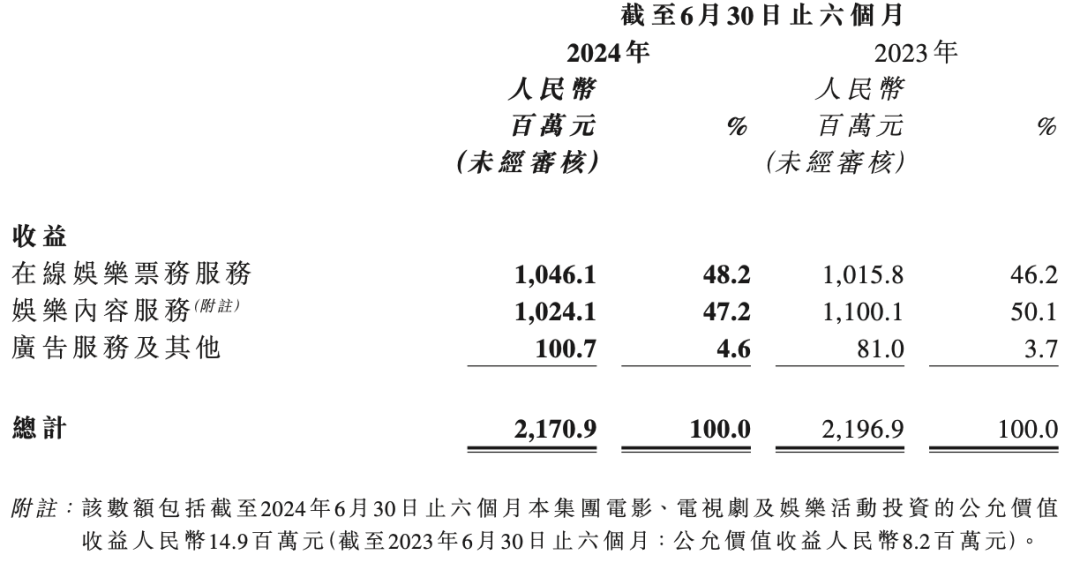 類似的情況也出現在貓眼的半年報中。貓眼在票房前五的影片中佔據三個席位。而其上半年營收約21.71億,同比下降1.2%。降幅雖小,但根據其細分板塊顯示,這部分收入減少均源於娛樂內容服務部分收入縮減。該板塊收入由11億減少為10.24億,同比下降6.9%。而財報中也提到,整體收益的下降,很大程度上歸結於其參與影片票房總量的下降。