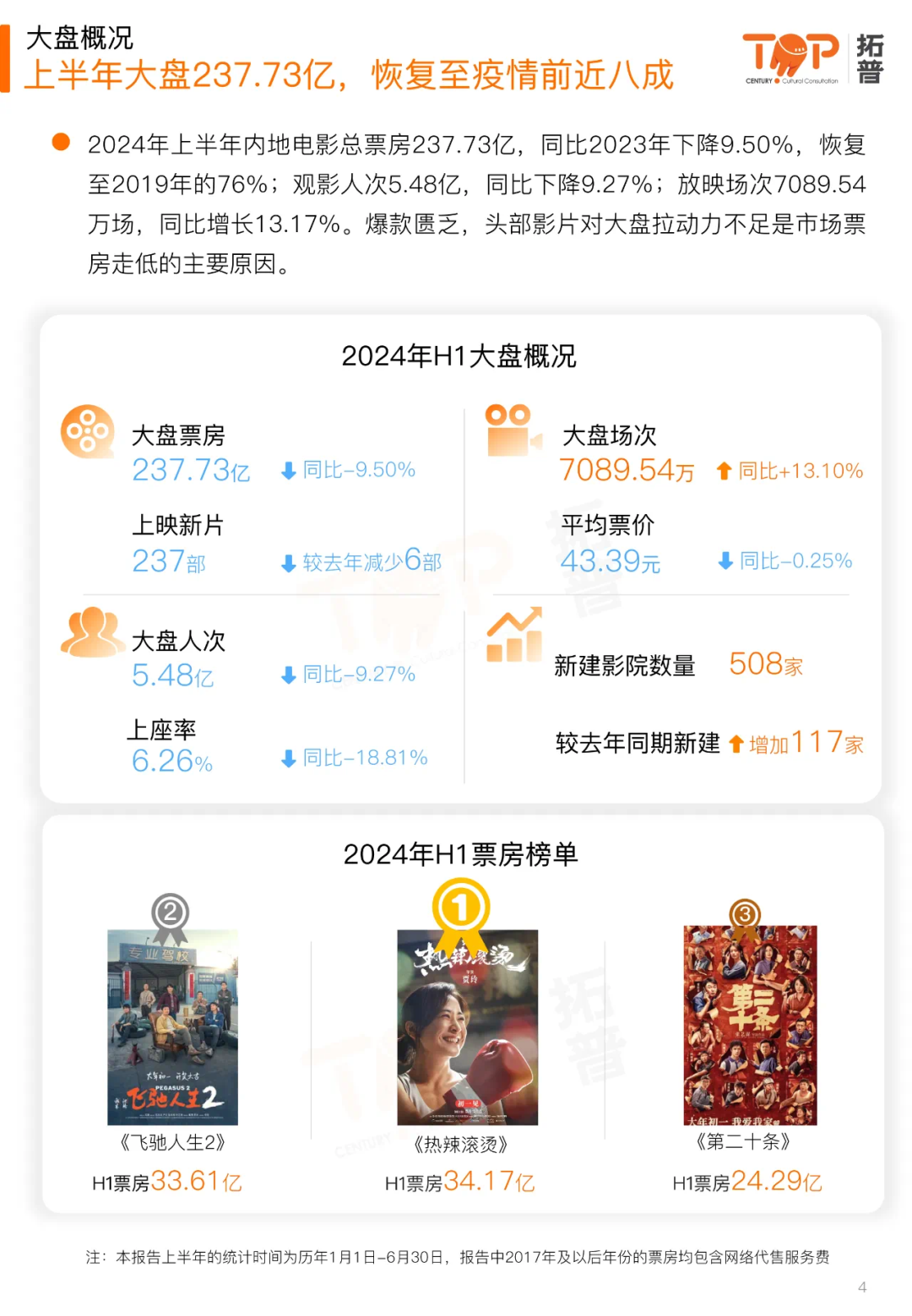 根據拓普數據顯示,今年上半年內地總票房為237.73億,同比下降9.5%;觀影人次為5.48億,同比下降9.27%。大盤縮減,爆款稀缺,觀眾流失已是不爭的事實。電影行業也與這樣的市場冷感不斷對抗着,當冰點再臨,法寶失效,電影公司再一次站在進退兩難的十字路口之間。