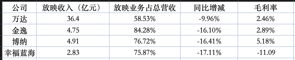 而其餘放映業務佔比高於六成的院線公司,也遇到放映業務的萎縮。其中幸福藍海情況更為窘迫,總體淨利潤下跌724.24%,虧損0.297億。而放映板塊的收入,毛利率為-11.09%。電影院不僅僅是難賺錢,更滑向了虧錢的一端。