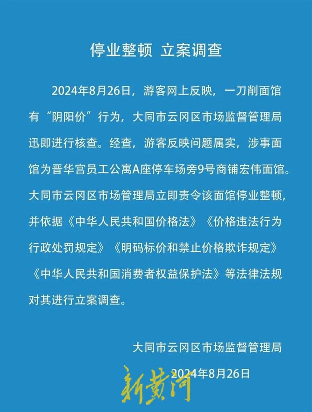 事後,山西大同當地市監局通報稱,遊客反映問題屬實,立即責令該面館停業整頓,並依據相關法律法規對該面館進行立案調查。有媒體採訪涉事麪館店主時,其解釋稱,該店一碗麪的價格普遍就是7元至8元,這次是服務員不小心把價格算錯了,並不是“陰陽價”,“這兩天雞蛋貴了,所以是2元,多收了他們6元,也已經退給他們了。”