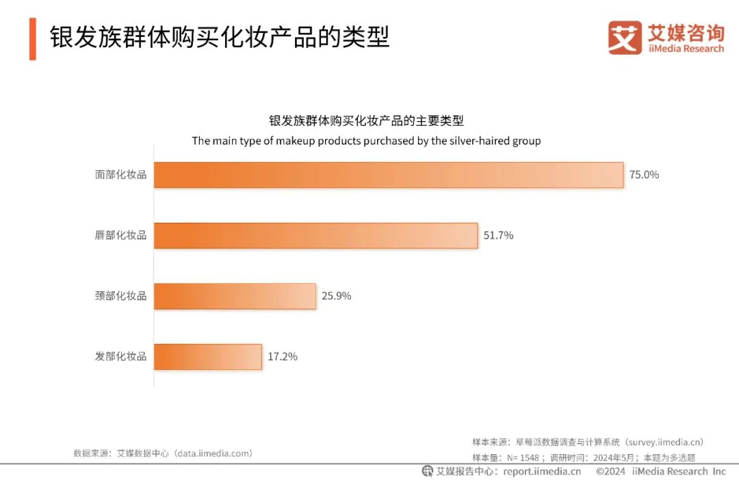 《2023年美妝新趨勢洞察報告》顯示,在抖音平台,“給媽媽化妝”話題持續高漲,播放量突破5000萬次。艾媒諮詢數據顯示,超七成銀髮族首選購買面部化妝品,其次是唇部化妝品。一線城市的50~70歲的老年人中,幾乎都會護膚化妝。