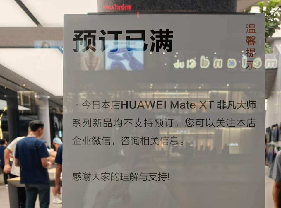 “早在預售第一天(9月7日)我們店裏的預定名額就滿了。”9月9日晚,時代週報記者探訪位於深圳萬象天地的華為旗艦店時,發現店門口顯眼位置擺放着“預定已滿”告示牌:今日本店HUAWEI MATEXT非凡大師系列新品均不支持預定。不過此預定不需要訂金,只需要提前登記意向。
