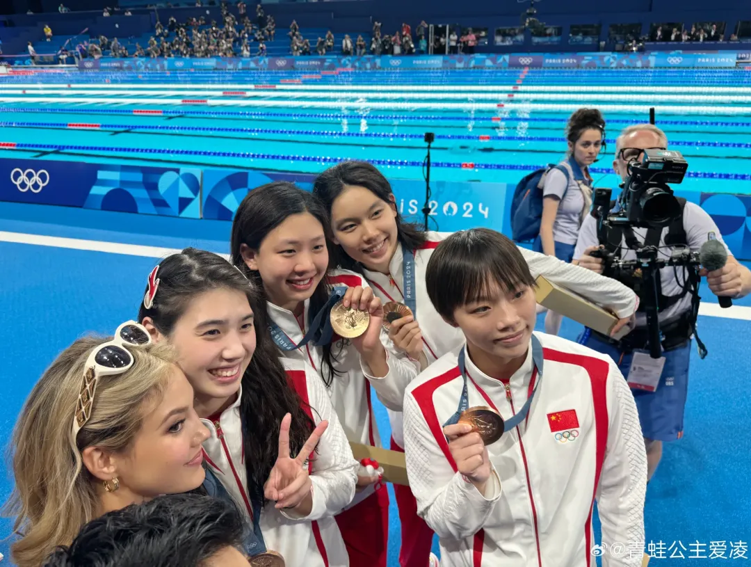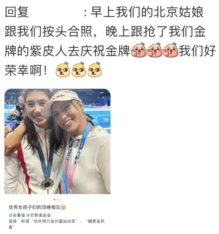 谷愛凌與跳水隊、游泳隊的合影,都站在了C位;與全紅嬋、潘展樂都有熱情互動,對鄭欽文卻並沒有求合影或送上祝賀,觀賽後便立刻離開了。