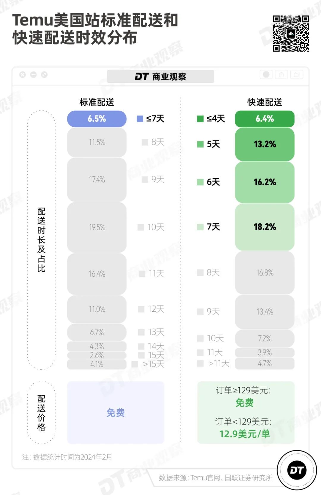 從今年2月Temu美國站的配送時長來看,8成的快遞配送時長超過一週,就算是選擇“快速配送”模式,消費者也很難在4天之內拿到快遞。