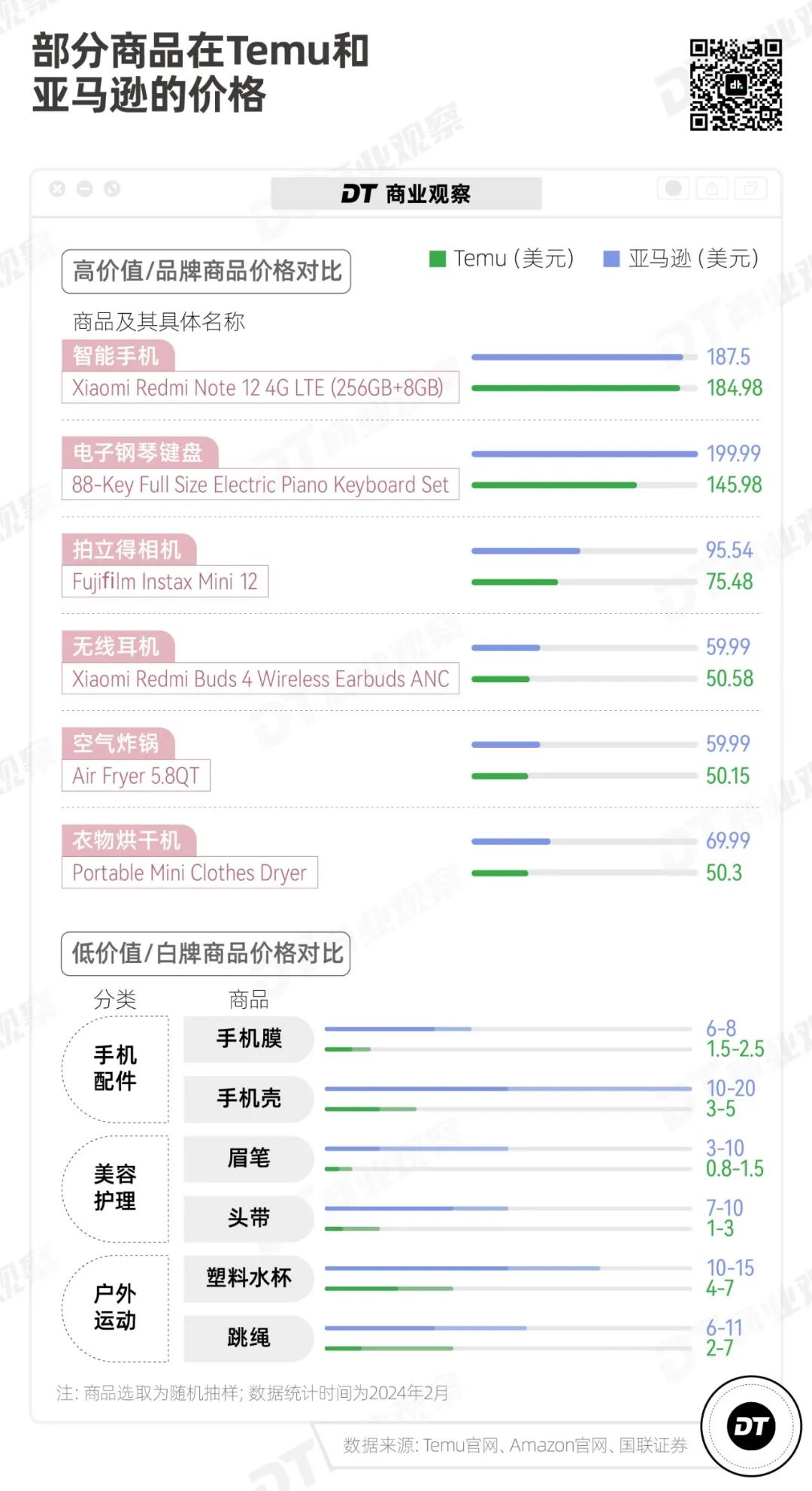 而相對低價值的、白牌小商品,譬如塑料水杯、手機殼,Temu價格甚至可以低到亞馬遜的1/3。