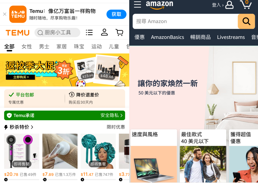 點進Temu和亞馬遜的官網,你會發現二者風格截然不同。