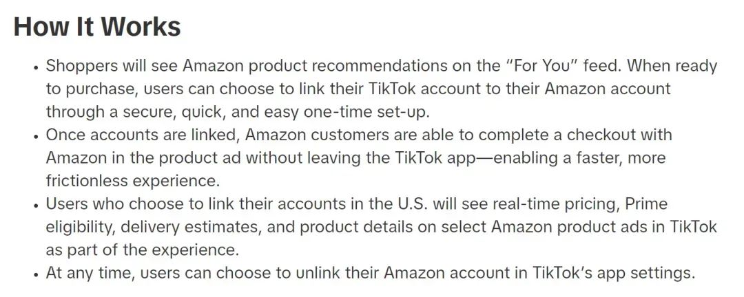 亞馬遜會在Tiktok裏投放廣告,消費者可以將自己的Tiktok賬户和亞馬遜綁定,並直接在Tiktok裏完成購買。