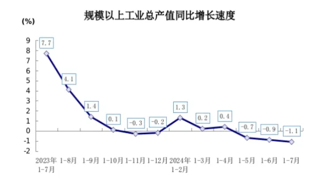 同比看下降1.1%似乎並不嚴重,可問題是工業總產值是從去年年中便開始了斷崖式下滑,然後就在0附近徘徊,最近三個月(5-7月)開始不斷下滑。