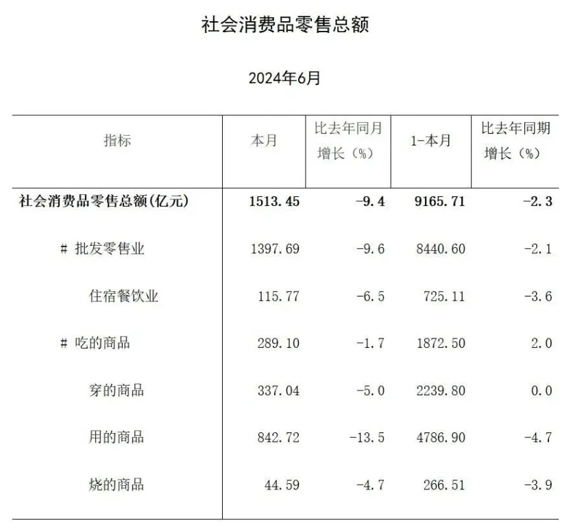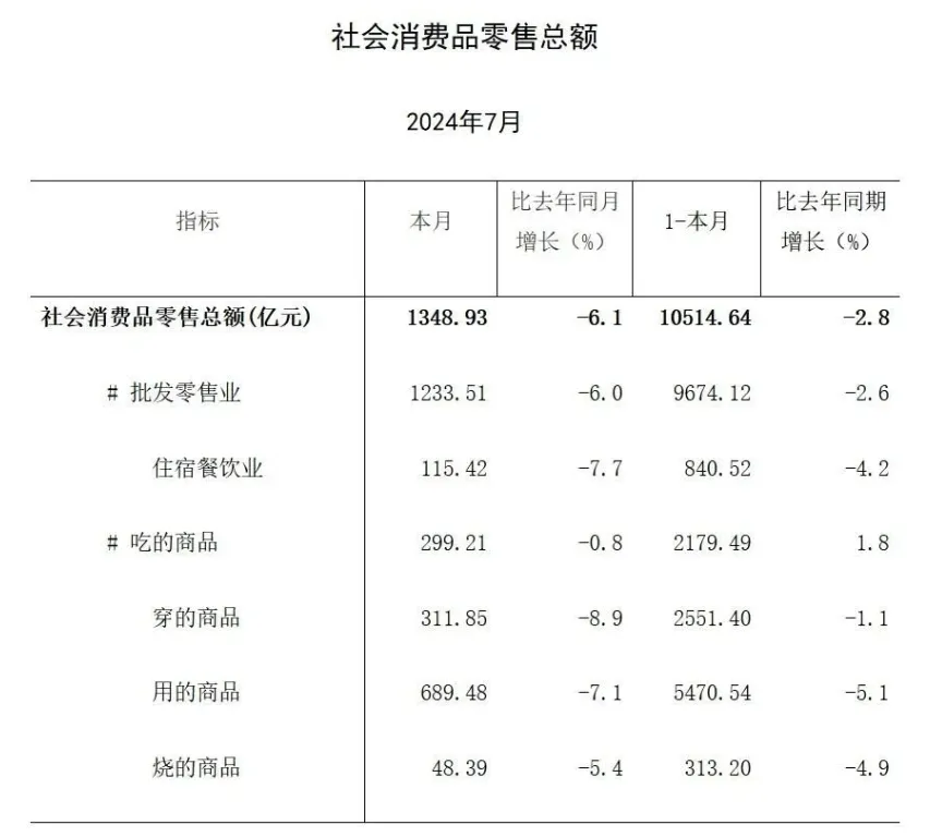 同樣是來自上海統計局數據,2024年1-7月,上海社會消費品零售總額10514.64億元,同比下降2.8%。