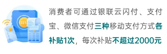 《實施方案》還特別説明了,消費者可通過銀聯雲閃付、支付寶、微信支付三種移動支付方式,各補貼1次。