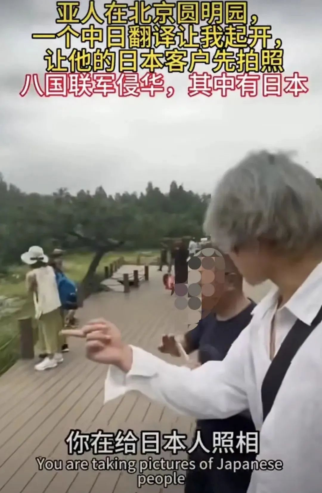 但接下來就不對味了——男子阻止翻譯給日本遊客拍照,認為日本人沒資格在圓明園玩。