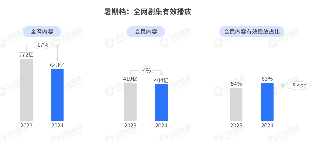 在這背後,其實能夠看出平台的內容打法有所調整。比起押注不確定性更強的大爆內容,視頻平台更穩妥的打法是做好垂類和腰部內容。尤其是在各平台會員機制愈發成熟的當下,激活付費用户的活躍度變得更加重要。從結果看,各平台也在今年暑期檔交出不錯的答卷,雲合數據顯示,在檔期劇集有效播放量同比下滑的前提下,全網劇集會員內容的有效播放佔比從去年的54%上漲至63%,會員活躍度對內容市場的影響還在進一步加深。