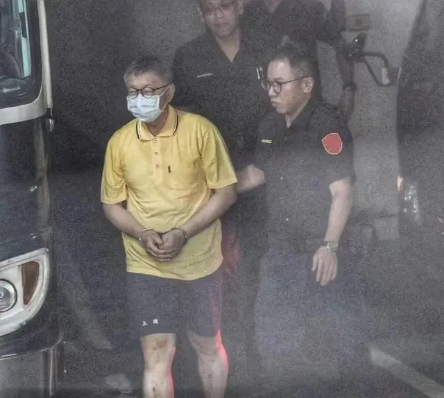 從報道畫面能看出,柯文哲雙手上銬、戴着黑框眼鏡、身穿黃色短囚服。還有報道稱,他當時身着深藍色短褲及藍白拖鞋步下囚車,面對大門外媒體喊話均未回應。