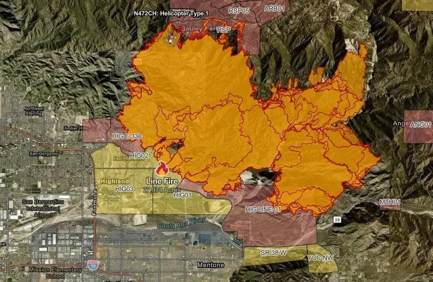 截至週二上午,已經燃燒了4天的“線火”(Line Fire),已經燒燬超過2.6萬英畝的山林,加州州長紐森已經宣佈進入緊急狀態,並派出國民警衞隊和美國森林服務局的消防員一起加入滅火的隊伍。