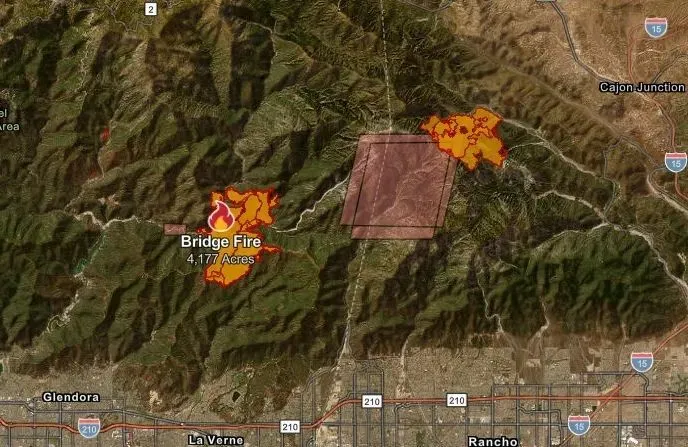 而在洛杉磯縣安吉利斯國家森林爆發的“橋火”(Bridge Fire),過火面積已經超過4100英畝。根據國家林業局官員介紹,這次火災一共有兩個火點,火勢在起火後幾個小時內迅速從 100 英畝蔓延至 800 英畝,截至目前為止尚未得到有效控制。