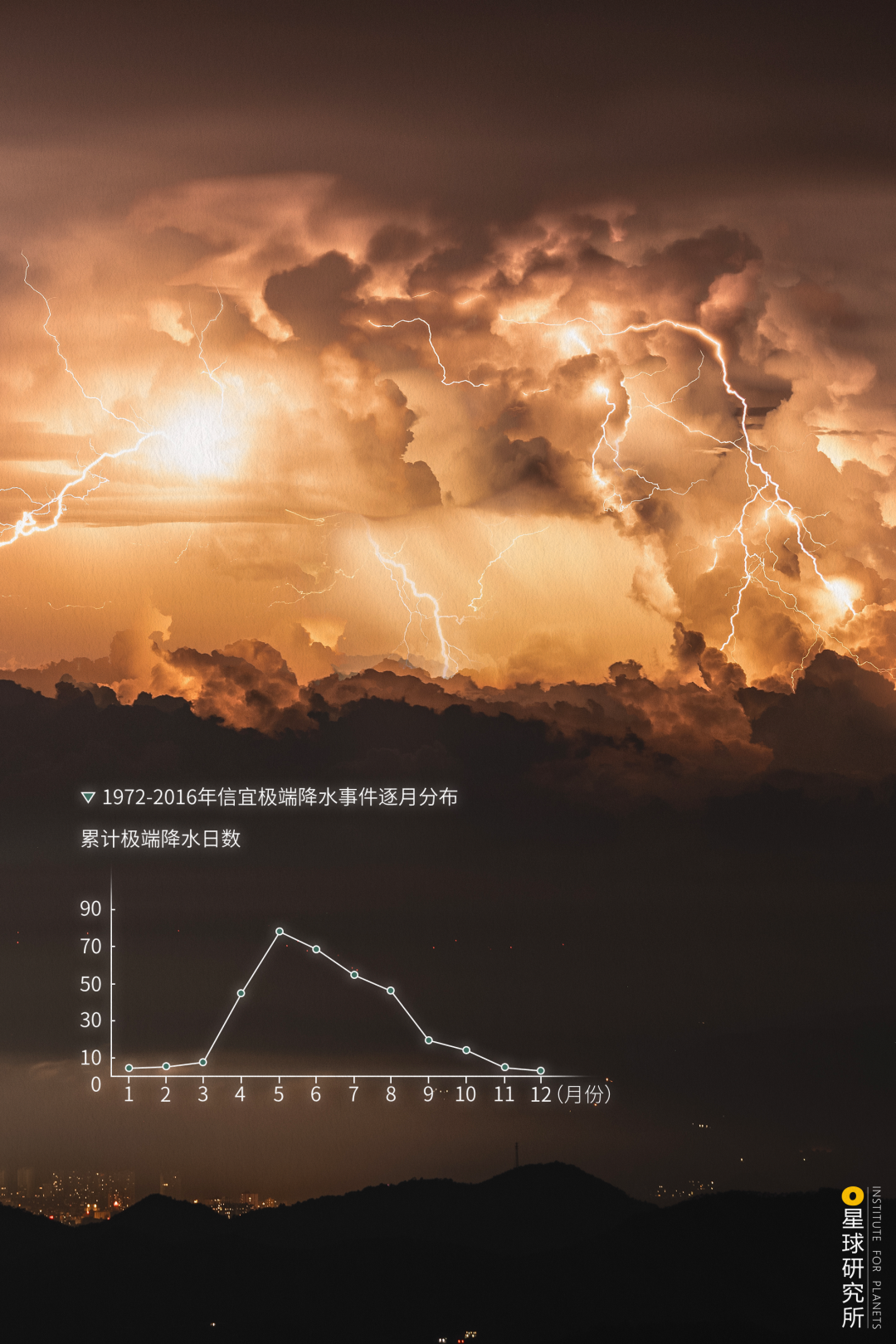 (大喊地雷暴&信宜極端降水逐月分佈圖,信宜地處高丘與中山地之間,氣流爬坡、對流強,每年的4-9月,暴雨頻發,攝影師@MiloPhoto,製圖@東平小龍/星球研究所)