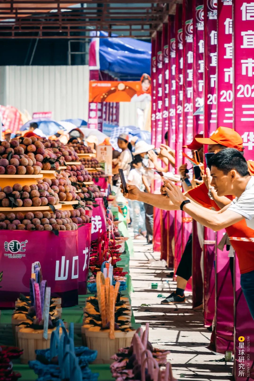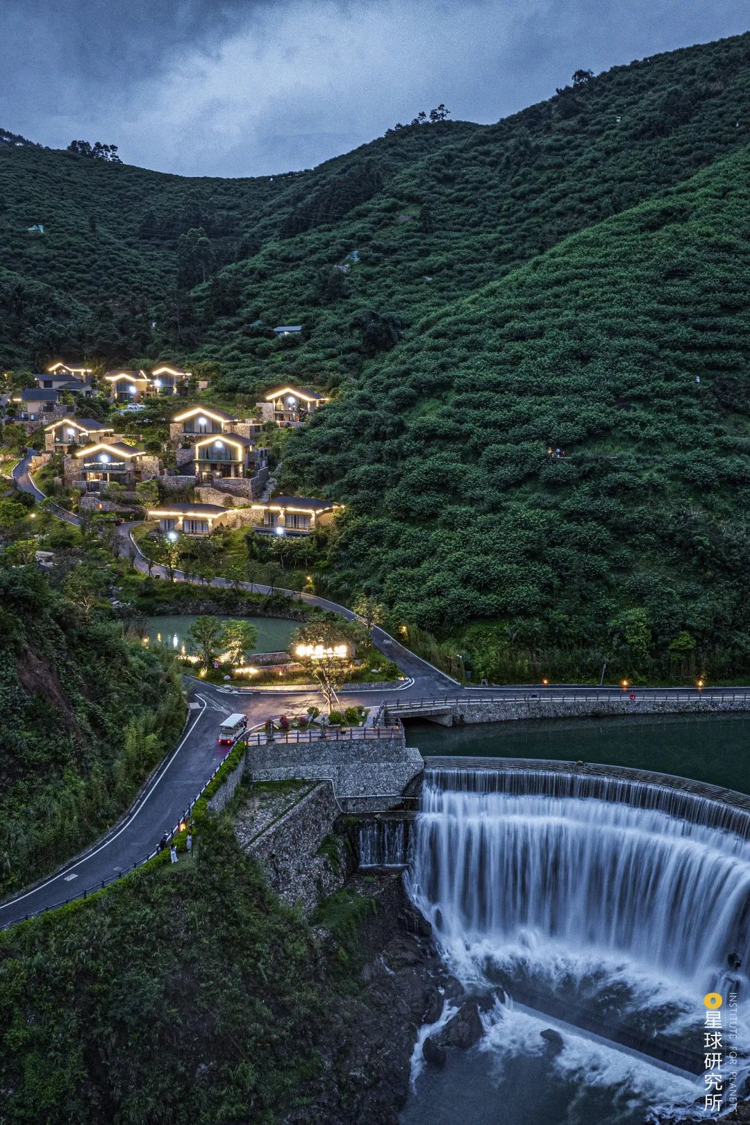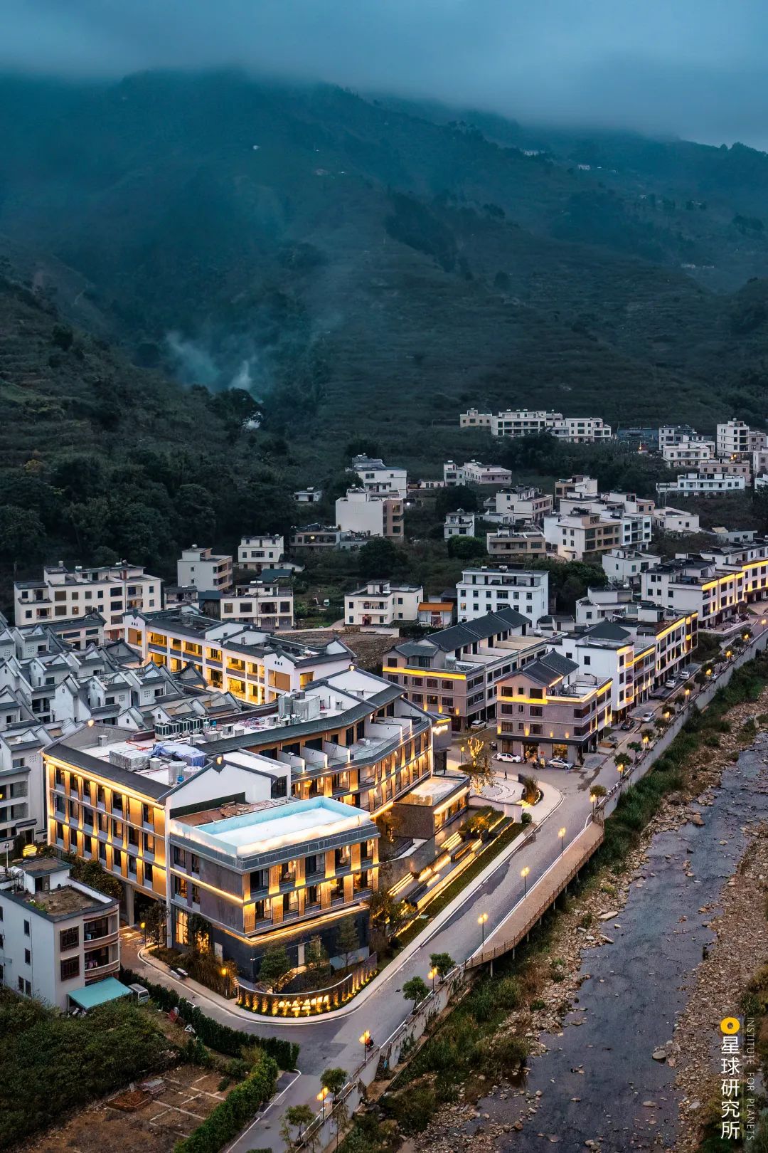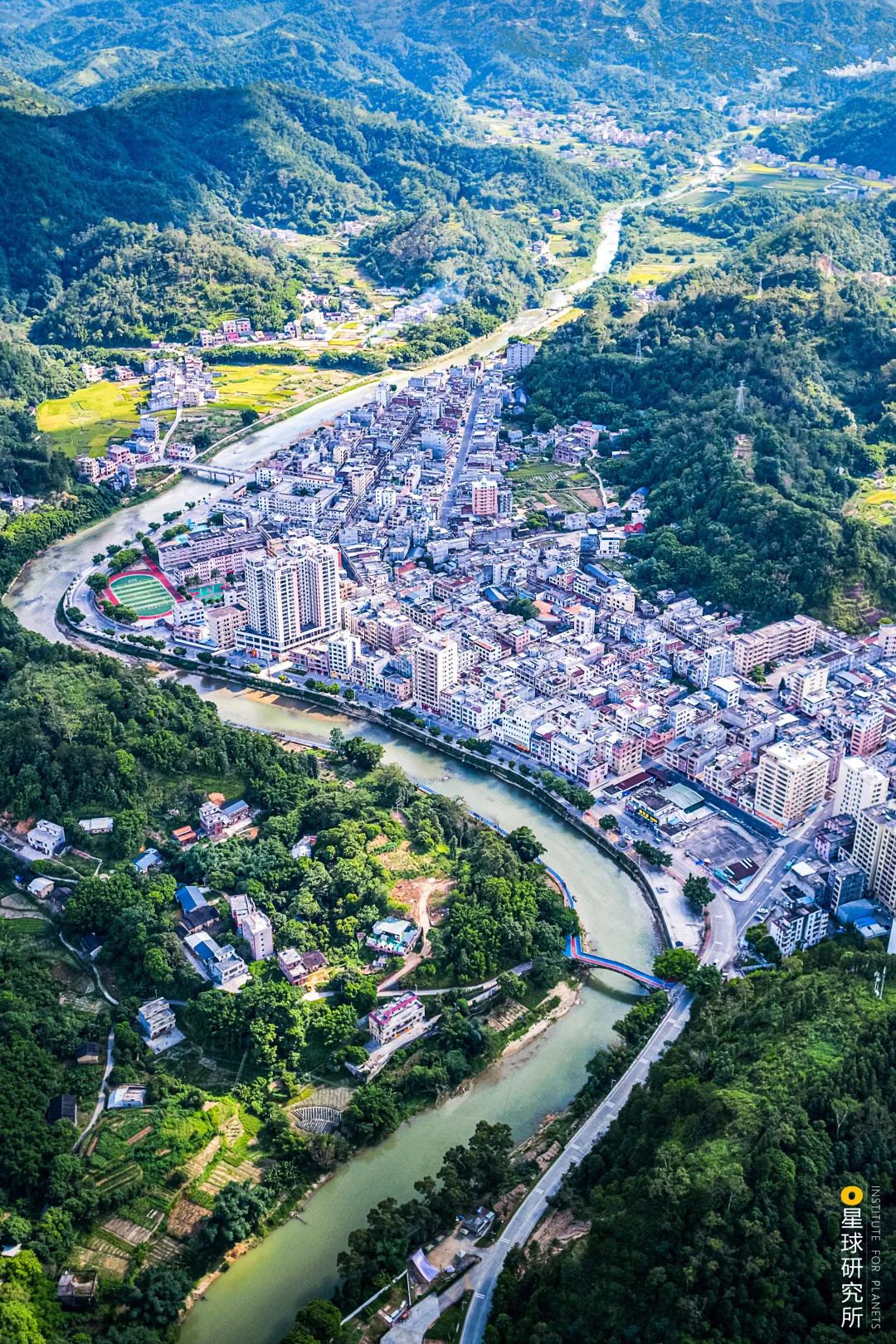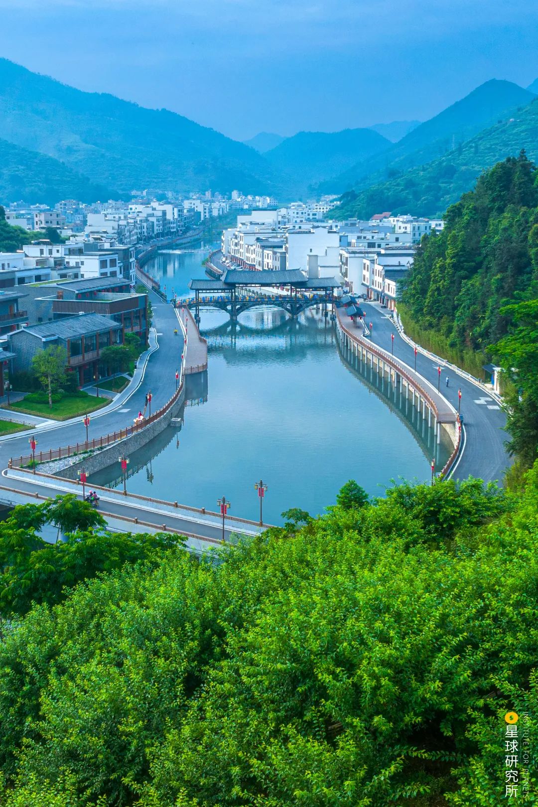 (信宜山水雙合·中國李鄉,背後的山漫山遍野皆種植李樹,河岸邊隨處可見民居、酒店,圖片來源@山水雙合)