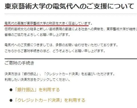 比如東京藝術大學,發過快負擔不起電費的公告,現在靠着舉行“提高電費音樂會”,用音樂會的收入來付電費。